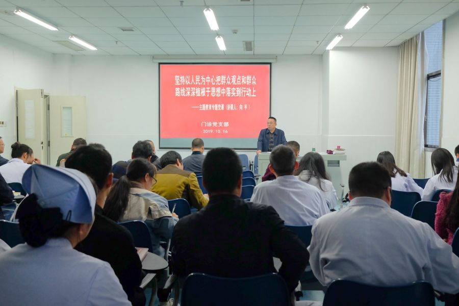 根据“不忘初心、牢记使命”主题教育工作部署,10月16日下午,门诊党支部联系院领导向平副院长在超声科示教室,为门诊支部全体党员和门诊系统副科级以上中层管理干部及护士长,上了一堂题为《坚持以人民为中心把群众观点和群众路线深深植根于思想中落实到行动上》实际而生动的党课。