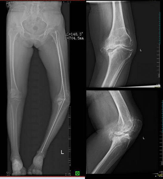 71岁的张某,约8年前出现左膝疼痛,2年前疼痛愈发严重,无法正常行走,苦不堪言,严重影响生活质量。张某及家人曾于多家医院就诊。由于张某左膝长期处于半脱位状态导致外侧韧带松弛,内侧韧带挛缩,术中平衡两侧韧带是巨大挑战,胫骨内侧平台严重塌陷骨缺损,常规人工关节材料不能修复骨缺损,手术难度大,风险高,预后差。多方打听后,家人慕名来到州人民医院骨一科找到赵峻主任,赵峻详细检诊后认为患者左膝重度骨性关节炎、左膝内翻畸形、僵直膝诊断明确,膝关节置换手术是最佳治疗方案。