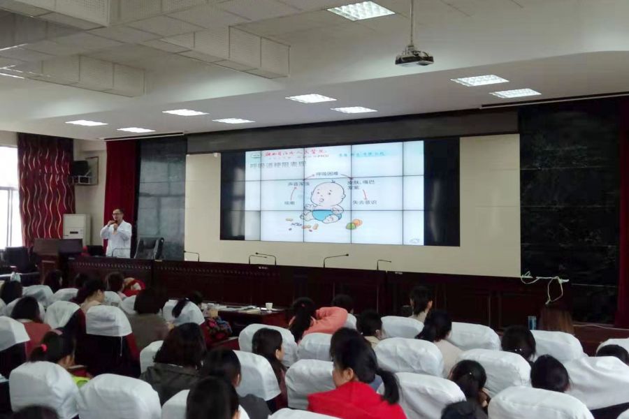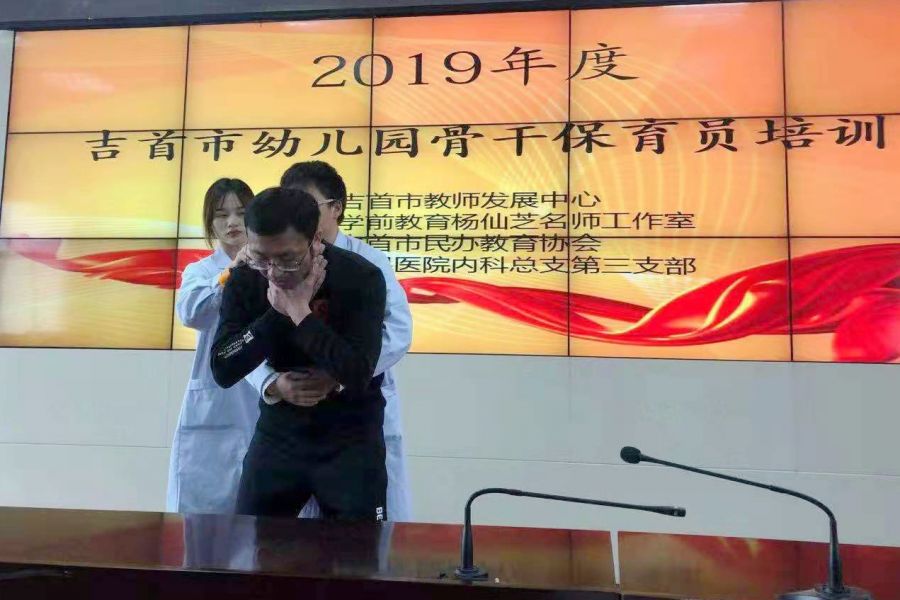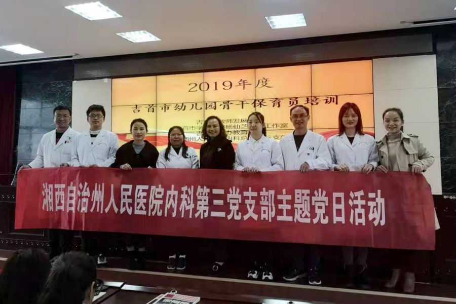 11月24日,内科党总支第三支部派员参加吉首市幼儿园骨干保育员培训,进行儿童有关疾病预防保健和急救等知识授课。