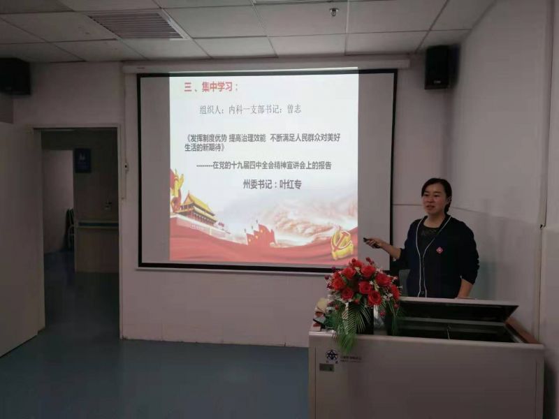 为加强党员同志们的政治素养,提高站位,在组织生活会上,安排了内容丰富的理论学习,首先组织大家进行“不忘初心,牢记使命”主题教育第五次集中学习,然后由内科一支部书记传达了州委书记叶红专在党的十九届四中全会精神宣讲上《发挥制度优势、提高政治效能,不断满足人民群众对美好生活的期待》的报告,学习了州委党校科技教研部副主任吴永良教授《开辟“中国之治”新境界》对十九届四中全会精神的解读专题报道。接着院长周明欢给党员同志们上了 《“不忘初心、牢记使命”充分发挥新时代党员先锋模范作用》主题教育专题党课、对党的十九届四中全会精神进行集中宣讲。最后院长周明欢对2019年支部工作和本次会议给予肯定,并对支部与党员今后工作提出了要求,理论是行动的向导,党员同志要加强政治理论学习,学习后重在落实,要立足本职工作,真正做到学以致用。