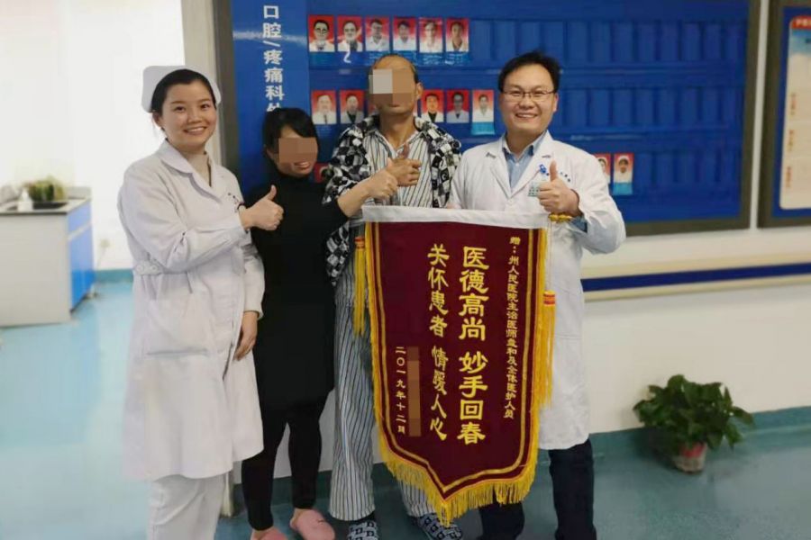 12月19日,口腔颌面外科收到一份特殊的礼物,一位患者将写着“医德高尚,妙手回春,关怀患者,情暖人心”的锦旗郑重的送至盘和主治医师手里。