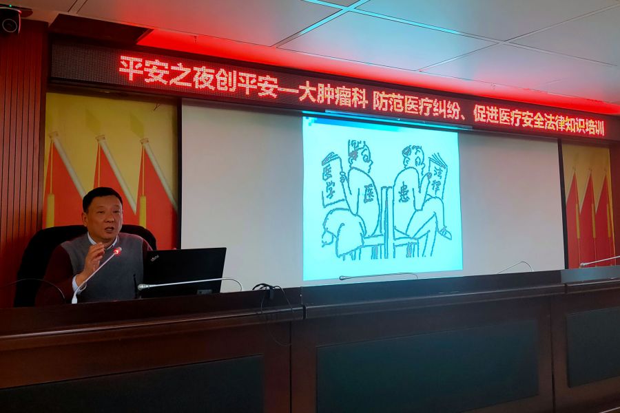 按照院党委将医疗安全关口前移的部署与要求,把医疗安全法律法规送到科室去,医疗安全管理科开展了“平安之夜,创平安”活动,12月24日下午16:00 在内科楼23楼大会议室,医疗安全管理科顾问丁纯志主任为肿瘤科医护人员开展了一堂生动的《防范医疗纠纷、促进医疗安全-法律知识培训》的讲座,肿瘤一、二、三科未当班的医护人员参加了本次培训活动。