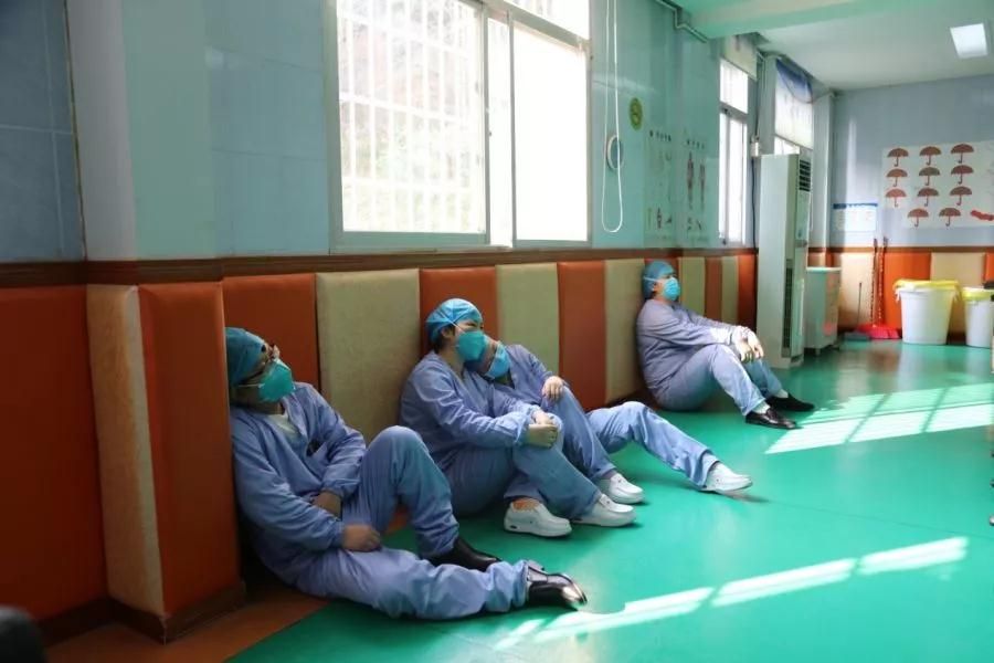 隔离病区出夜班的的医护人员刚忙完上午的工作,席地休息一会儿