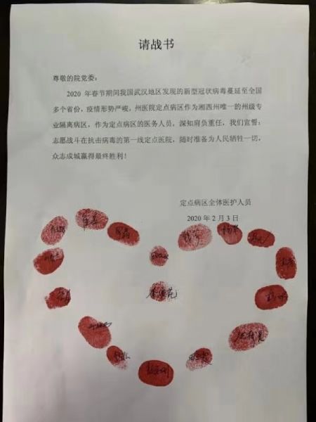 2月3日,在湘西自州人民医院新型冠状病毒感染的肺炎救治定点病区,在一份打在4A纸上的请战书上,在共产党员、病区护士长李康花带领下,医护人员的手印纷纷落下,17个红手印汇聚成了一颗大大的红“心”……