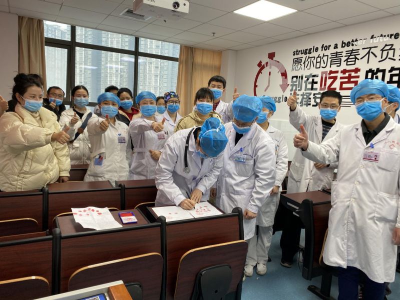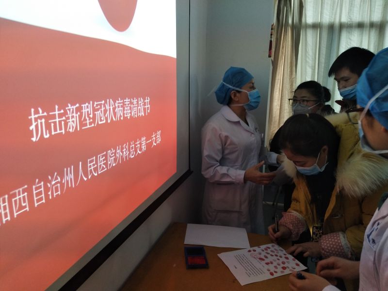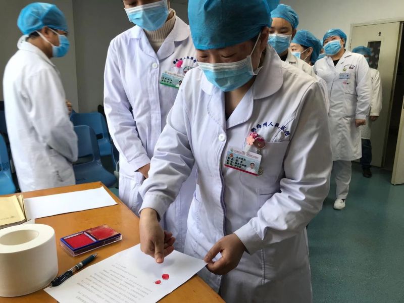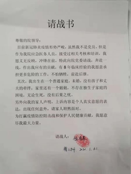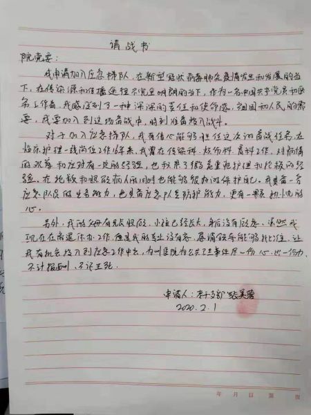 2月1日,在院党委办,一位面带口罩的女士来到院党委办,替她的丈夫递交了一份简短的请战书。