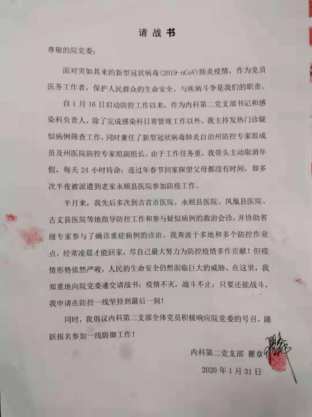 请战人是该院呼吸内科副主任医师马继扬。前不久,他被紧急抽调到永顺县疫区去增援防控、救治工作,说走就走,来不及亲手将请战书交给党组织。