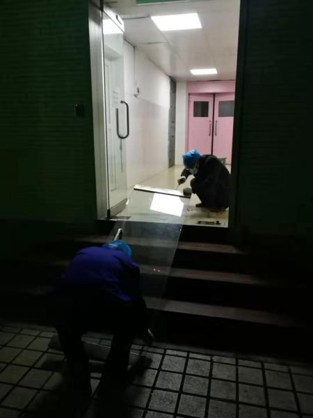 维修组工作人员对定点病区清洁通道门进行更换维修