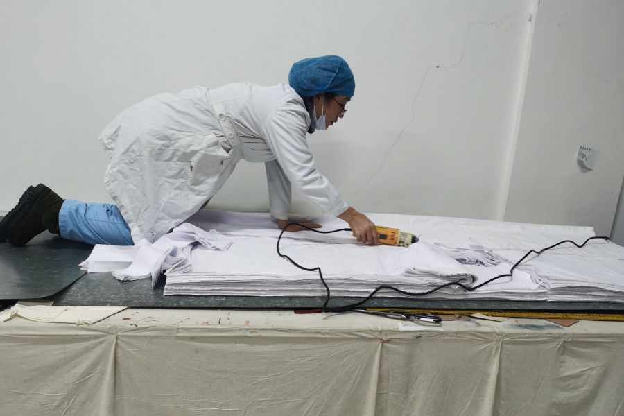 晚上11点钟为次日需要制作的服装裁剪布匹
