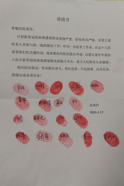 宋奎博士,为了防控一直在州内上下奔走,在院内来回穿梭,累得喘不过气,仍多次请战武汉,希望能和武汉的同学并肩作战。这次,他所在的血液科18名医护人员集体请战。他说:“我们科里的每一个人,无论是业务素质还是个人意愿,都可以支援武汉。”