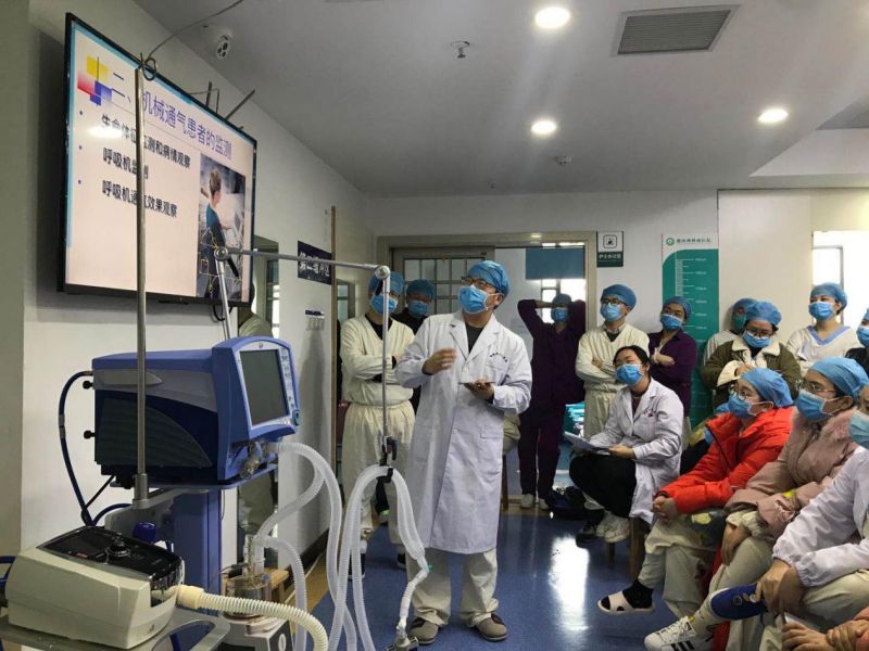 培训现场,梁民勇为各学员进行无创呼吸机、有创呼吸机、高流量氧疗仪器等使用及操作技巧,用临床案例生动形象的分析了临床上出现的各种问题,让学员们详细了解仪器的原理和基本使用方法。同时,重症医学科副主任医师胡龙、呼吸一科副主任医师颜学刚相继为学员培训新冠肺炎的临床相关知识。新冠肺炎理论培训、个人防护的实战操作、仪器操作、患者住院后相关流程、应急预案……学员们认真做笔记,课堂气氛热烈,为提升自己的能力加班加点。