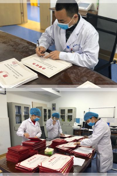 梁民勇副院长、彭晓萍和杨雪芬护士长给学员们准备合格证书