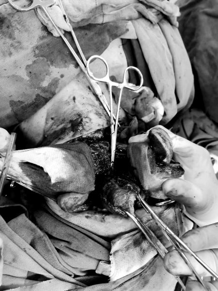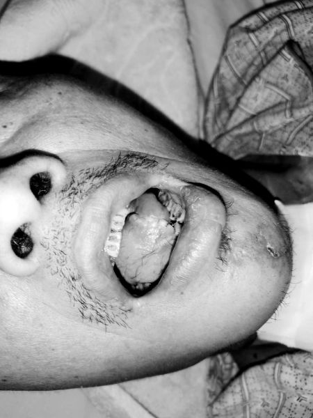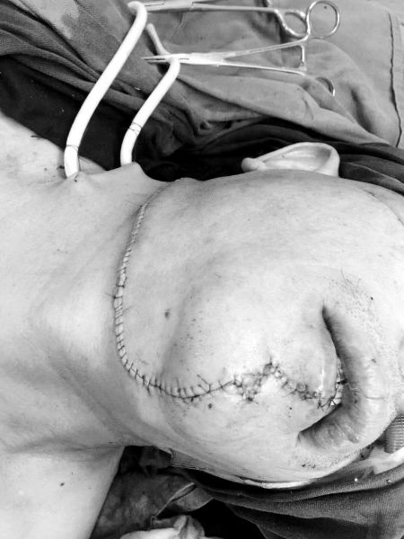 在排除新冠肺炎的前提下,于正月十二开展了这一肿瘤限期手术。期间,手术历时9小时,进行右舌口底癌扩大切除术+颌骨固定内固定术+右颈部淋巴结清扫术+左侧股前外游离皮瓣转移修复术+微动静脉血管吻合术+气管切开术。手术顺利,完成了口腔科此类病例的突破,术后,经对症支持治疗,皮瓣成活,患者半月后康复出院。