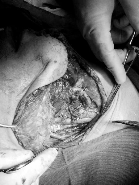 术前,在科主任、副主任、主治医师等人共同研讨下制定多套治疗方案并得出结论:患者因舌癌范围大,术中沿肿瘤外周再扩大切除1.5cm,意味着要切除半个舌头及口底,修复重建有很大困难和风险,若考虑前臂游离皮瓣较薄,修复口底没肌肉充填,术后易形成口底瘘,而取胸大肌带蒂皮瓣修复舌缺损,可能会影响舌体活动度。最后大家认为股前外游离皮瓣是最适合的,但科室自主从未制取先例,而且很容易在制取股前外游离皮瓣或动静脉血管吻合过程中出现特殊情况造成整个手术失败,风险及并发症极大。这时,科室主治医师盘和主动请缨并自信道:“总会有第一次的,请放心让我取瓣吻血管吧”。