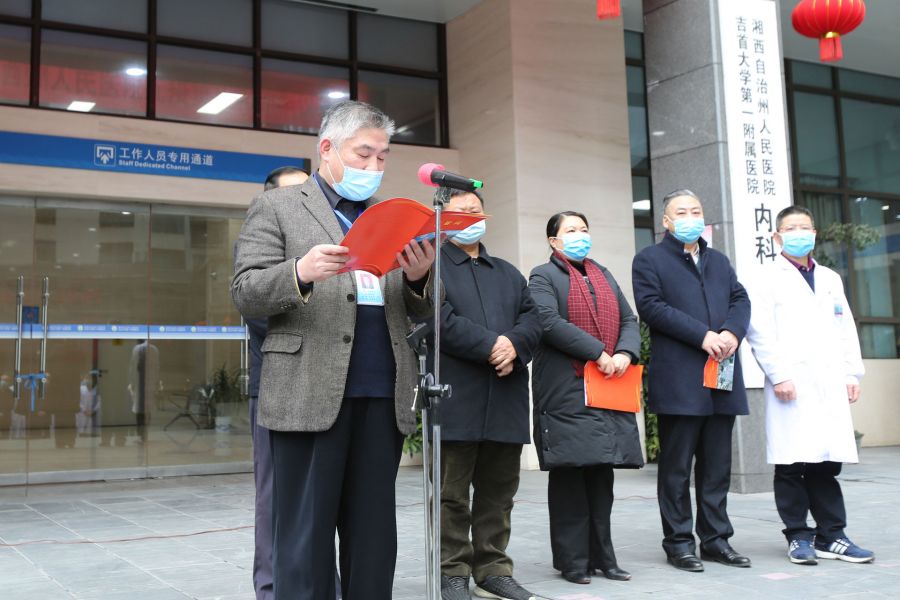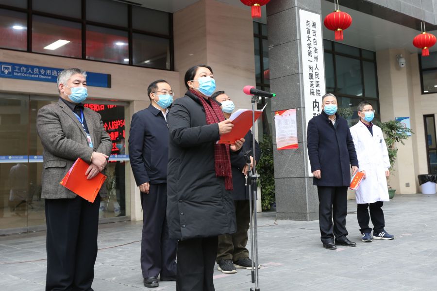 副州长吴凌频代表州政府感谢扬子江药业集团在抗疫疫期间的爱心捐赠和善举。吴凌频肯定了州人民医院在湘西州疫情防控及救治中发挥的重要作用,她表示州人民医院1月16号率先在全州建立起应对疫情的隔离救治体系,起到了阻力军、扛大旗的作用;组建了全州的救治专家组,派出医护人员30余人次奔赴8县市指导防疫防控及救治工作;牵头组建了州新冠肺炎定点医院的工作班子,做好了集中收治全州新冠病例的充分准备工作;还选派了2批次共计19医护人员支援武汉,彰显了湘西儿女舍小家、顾大家的赤子之心和精神风貌。