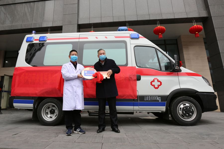 院长周明欢与扬子江药业集团湘西片区章建明总经理在抗疫负压救护车前交接钥匙和车辆