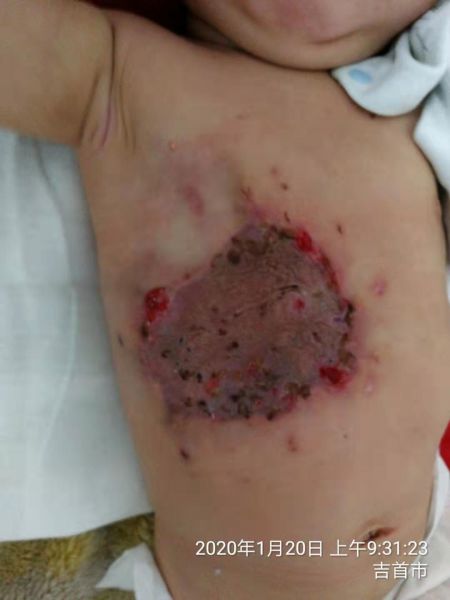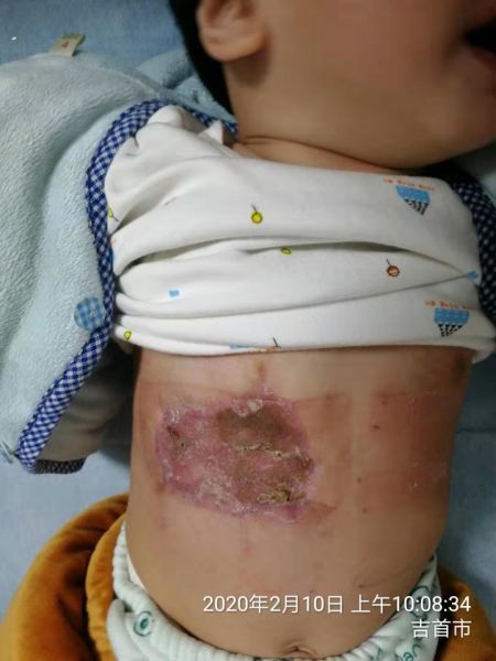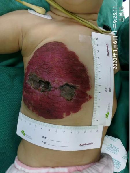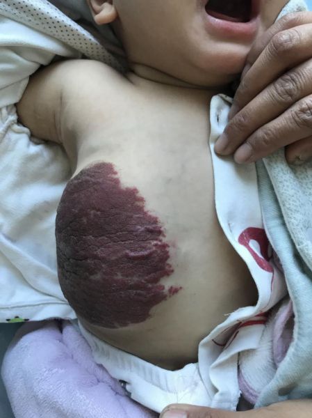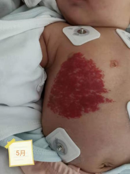 2019年5月,来自凤凰县的吴某夫妇焦急的来到州人民医院烧伤整形美容科,因为他们出生仅16天的儿子胸腹壁的“胎记”近日迅速长大,比出生时大了一倍,且已蔓延至右侧乳房,以为是娘胎带来的“毒瘤”,十分恐慌,在朋友的介绍下来到了州人民医院烧伤整形美容科就诊。
