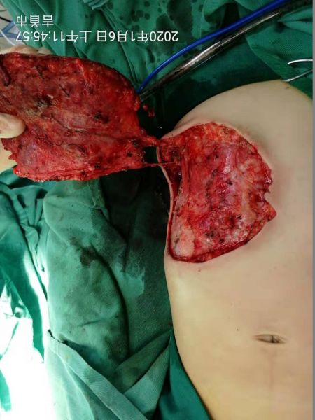 此时,面对这突如其来的“不速之客”,患儿必须马上进行手术,原定于1岁后再进行的手术不得不被提前了,否则创面持续渗血渗液导致失血性贫血及全身感染等后果不堪设想。2020年1月6日,在充分备血情况下,由李莉副主任医师担任主刀、陈朝超副主任医师担任主麻的安排下,手术顺利进行。血管瘤切除后的继发创面从患儿大腿取刃厚皮移植一期修复,手术历时4小时,术后患儿成功麻醉复苏,安全送返烧伤整形美容科病房。经过精心的治疗和护理,术后2周患儿痊愈出院。由于患儿血管瘤侵犯右侧乳头,术中予一并切除,嘱其成年后再返院行乳头再造术。看到身上的“定时炸弹”被成功摘除,且担心儿子因“无乳”这一缺陷被歧视的担忧被打破,患儿家属的脸上露出了久违的笑容,感叹于烧伤整形美容外科的精湛技艺。