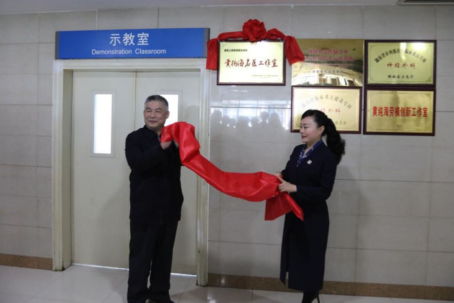 4月15日,州卫健委党组书记、主任邓建英为州人民医院黄纯海、宋奎、宋新三位专家“名医工作室”挂牌、揭彩。州卫健委副主任彭志新,州人民医院党委书记彭剑涛、院长周明欢、副院长贾小卷、向平及相关职能科室负责人参加挂牌仪式。