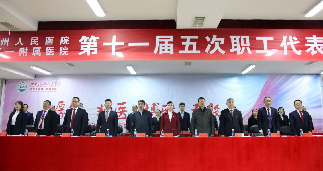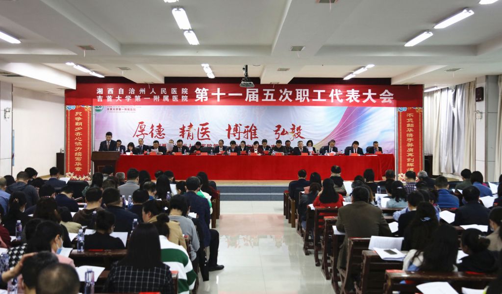 上午9:00,大会在庄严的国歌声中拉开序幕。州总工会党组书记、副主席石建军,吉首大学校工会常务副主席王先述,州卫健委党组书记、主任邓建英出席会议。副院长贾小卷主持会议。