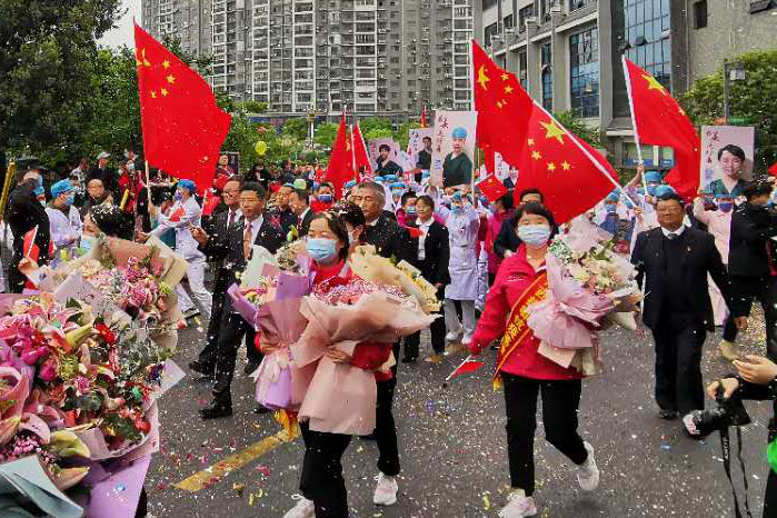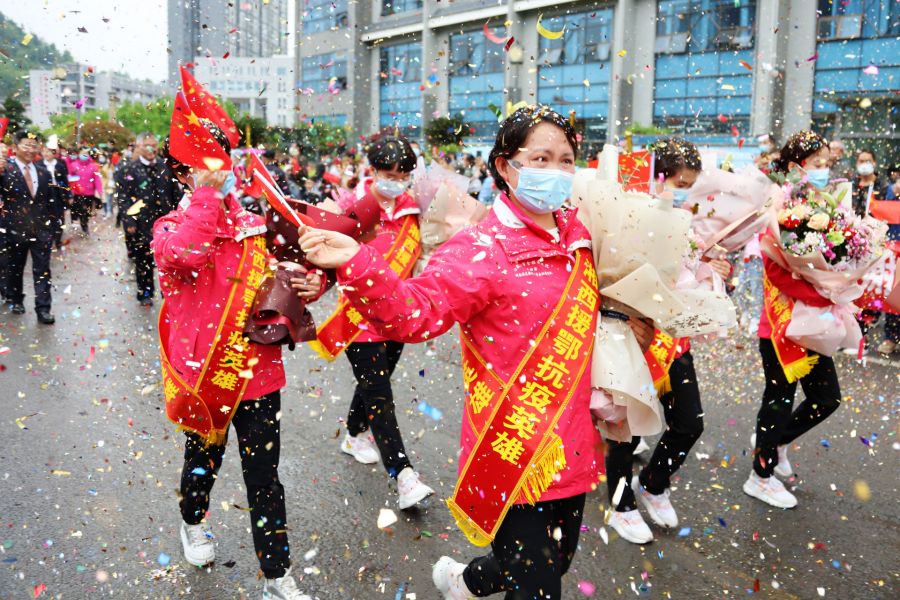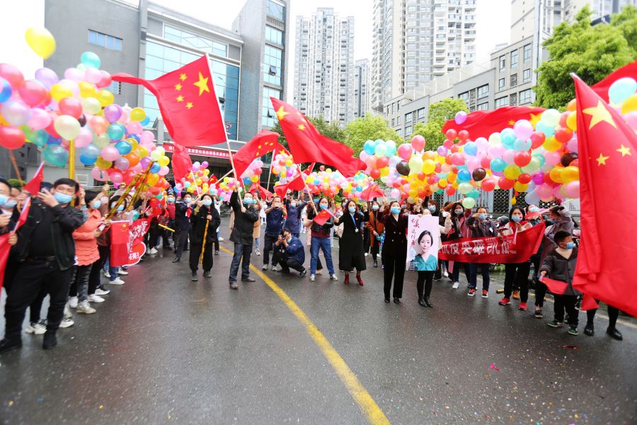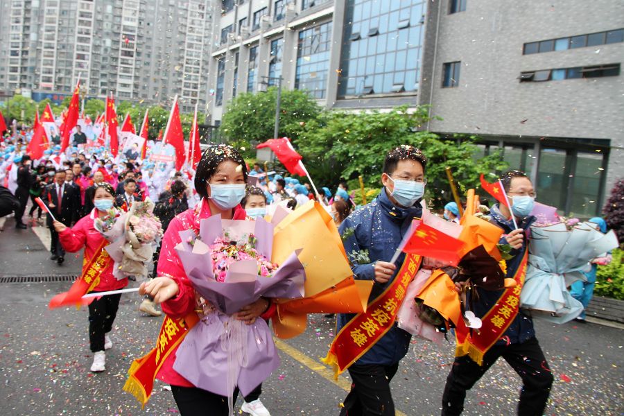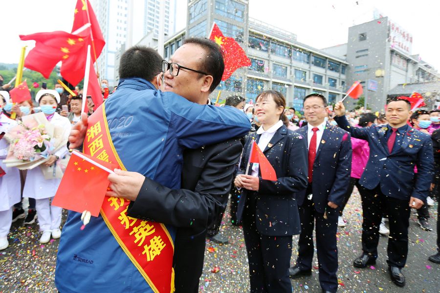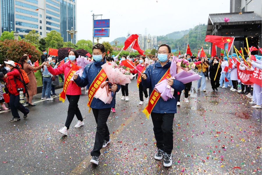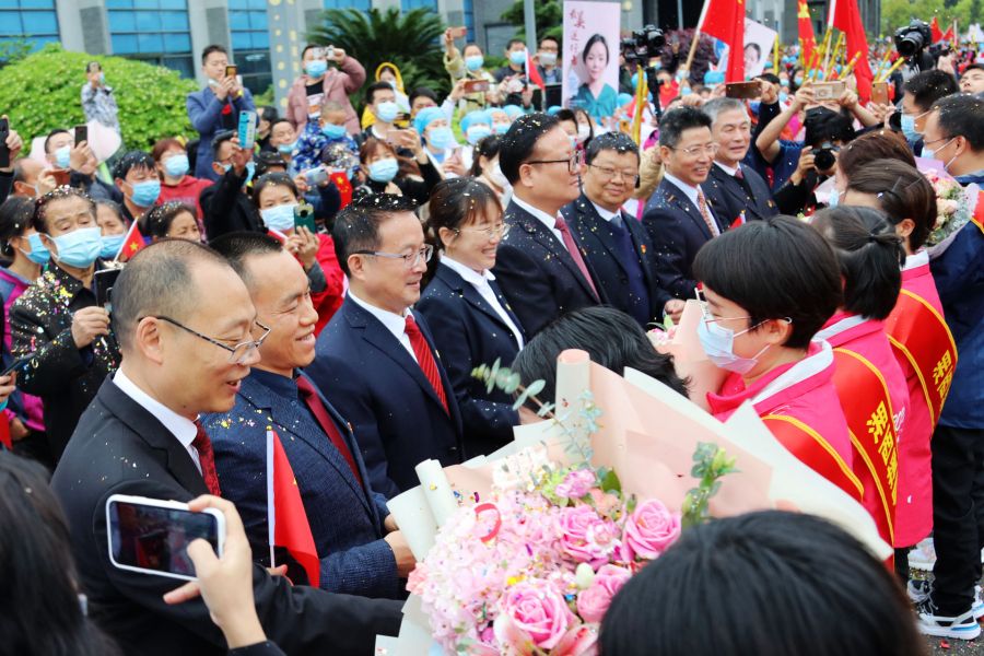 上午9时,州人民医院门诊大楼前乐音动人,全院职工着装整齐,穿着白大褂、戴着口罩在医院大门口排成长队静静等候。10时30分,远处警车开道以最高规格护送“最美英雄”从民族文化广场缓缓驶来。车辆刚驶入医院大门,百炮齐放,院领导、职工们集体夹道欢迎,院领导一一深情拥抱队员并给“最美英雄”献花,两侧列队站好的职工手挥五星红旗、双手鼓掌,齐声高呼,热烈欢迎9位抗疫“英雄”平安归来。