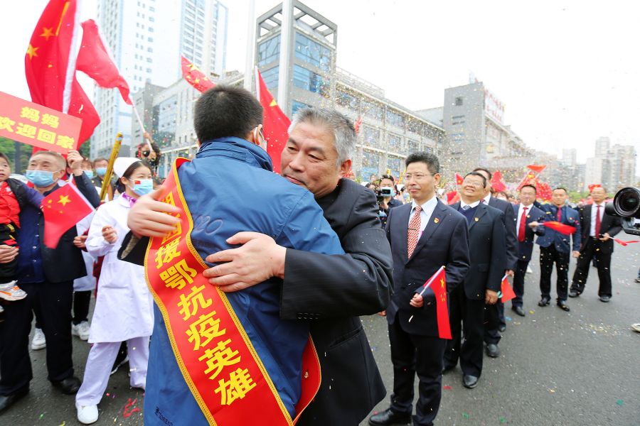 欢迎仪式结束后,现场的医护人员纷纷涌向前,与英雄们合影留念,用镜头瞬间记录了州医人情深义重的亲情和友情。