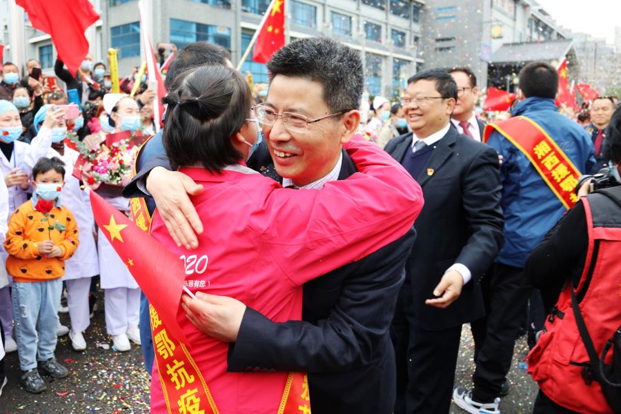 院长周明欢表示“抗疫”英雄们去时寒风凛冽,归来时,春光明媚,山花烂漫,美丽的春天因为英雄的壮举而更加绚丽灿烂!2月21日,第二批“抗疫”英雄们在国有召时,毅然主动请缨逆向而行,在武汉市金银潭医院重症综合病区、危重症病区奋战一个多月,克服了重重困难,用自己的精湛的医术、辛勤劳动和无私奉献,给武汉、给全国人民交了一份合格的答卷。周明欢要求,全院干部职工要以援鄂英雄们为榜样,学习他们拼搏与奉献的精神,履职尽责做好自己本职工作。