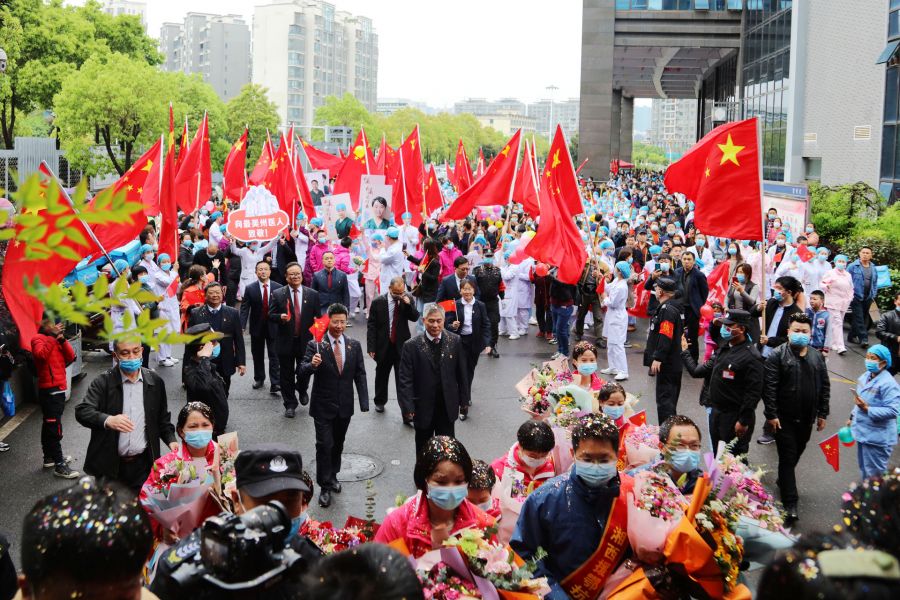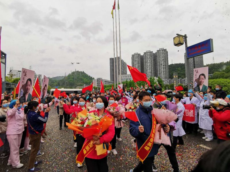 4月21号,春光明媚,州人民医院第二批援鄂医疗队员——何忠、石红印、彭涛、张帆、张庭艳、聂八玉、蔡云春、欧小红、牛丽萍经14天休整正式返院,州人民医院举行隆重的欢迎返院仪式。全体院领导、各职能科室科长、临床医技科室主任、护士长及1000余名医护人员早早等候在医院大门口,迎接英雄回家。