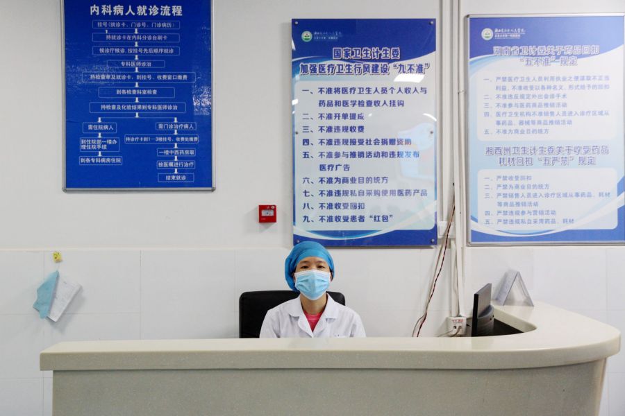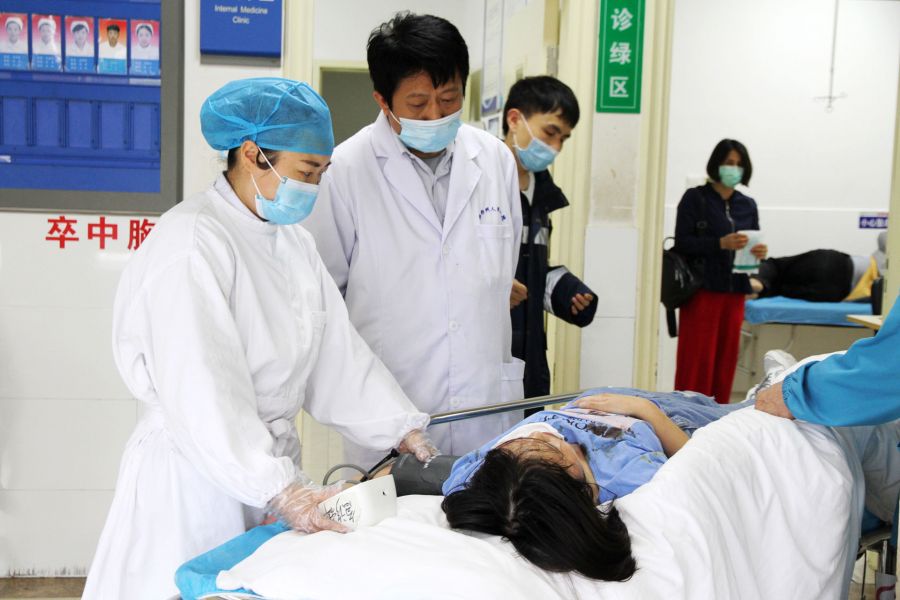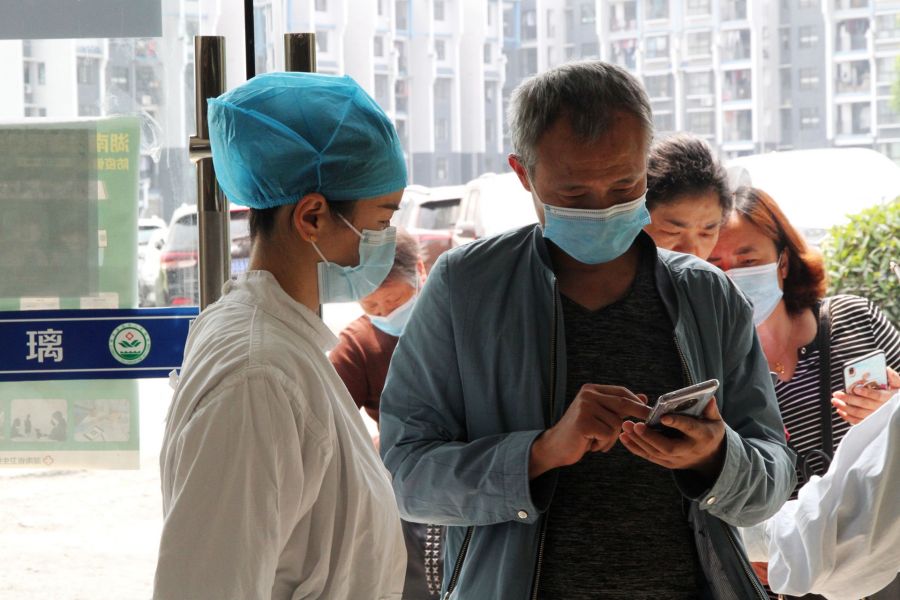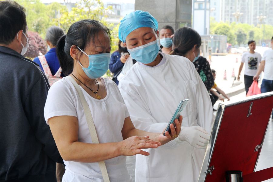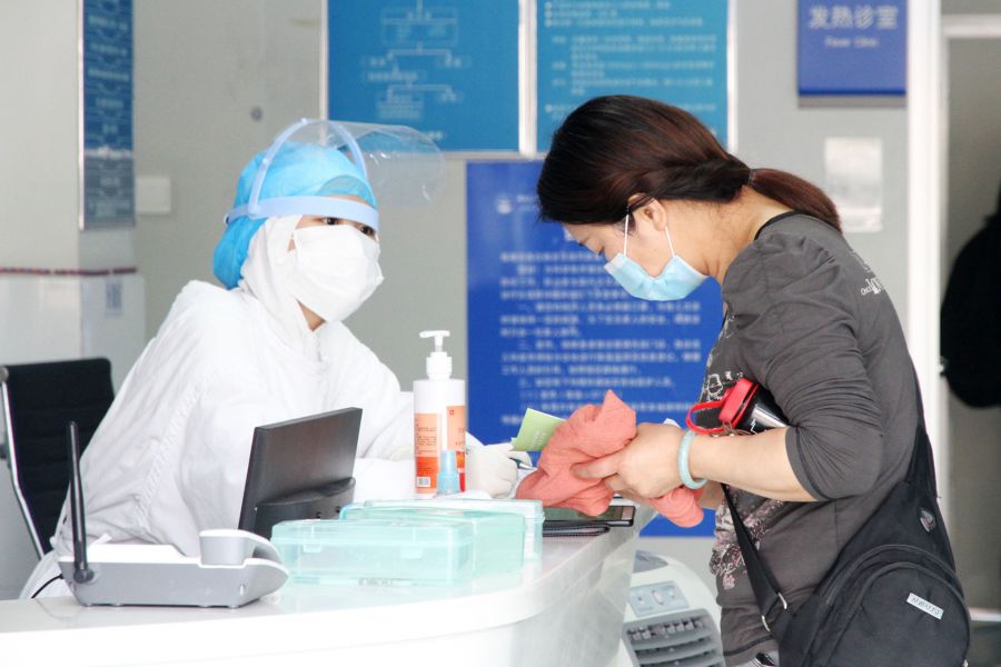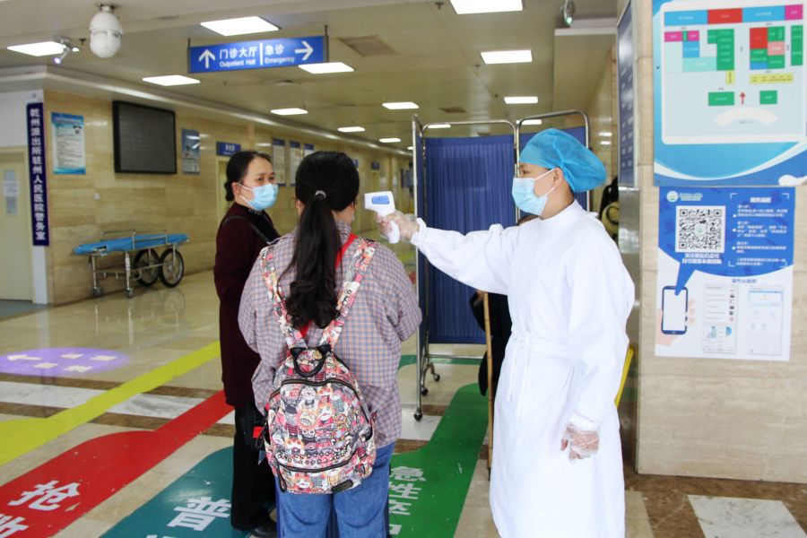 急诊大厅的医务人员对前来就医的患者进行查验健康卡和体温测量,确保不漏过任何细节。
