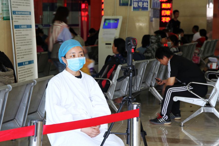 门诊大厅负责观察红外线体温检测的医务人员,一刻也不能放松分神,时刻专注体温监测情况。