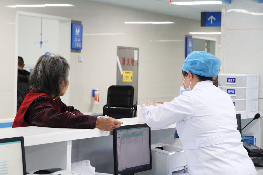 住院部值班护士正在给患者解答疑问,帮助处理小伤口。