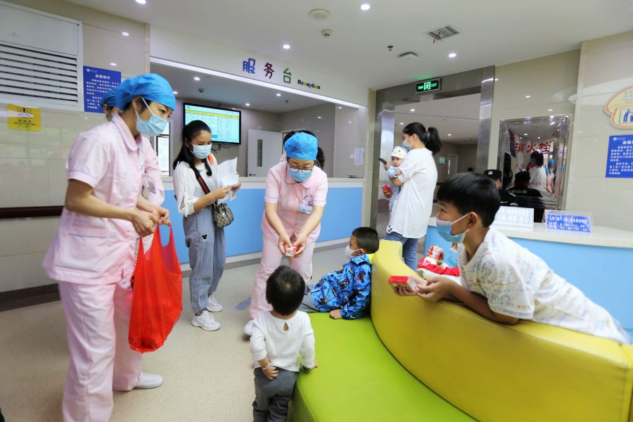 “今天是六一儿童节,祝各位大朋友、小朋友节日快乐。”在儿科候诊室里工作人员一边广播祝福,一边给孩子们派发牛奶,为他们送去节日祝福和关爱。