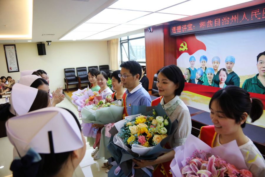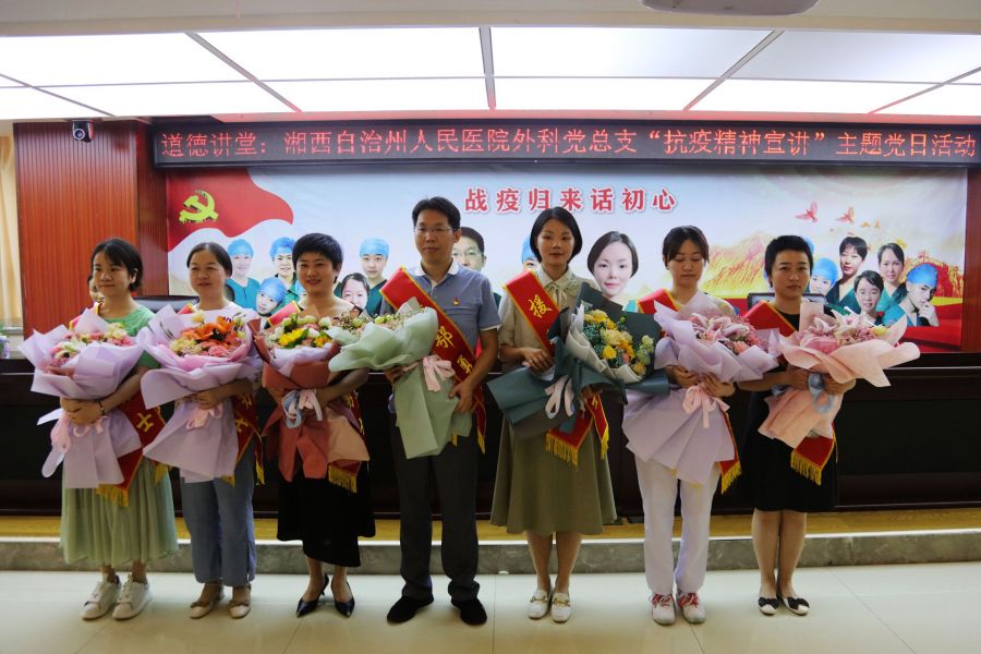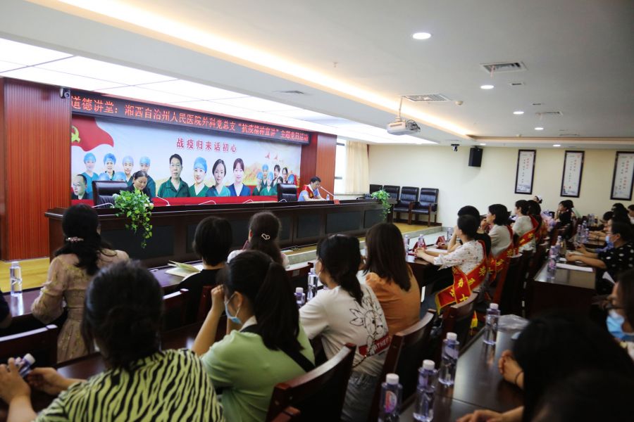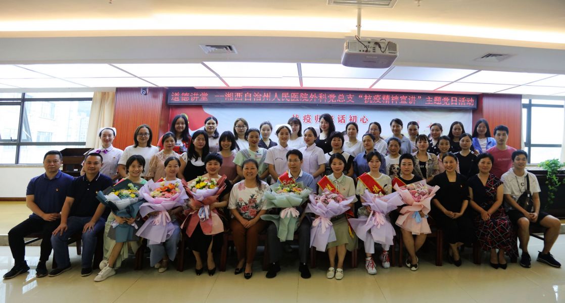 我院支援湖北医疗队队员代表何忠、彭涛、黄娟、师银莎、李孟帆、张帆、伍凌萧等参加宣讲活动。会场上,外科党总支的代表向抗疫英雄们献上鲜花,表达了大家对他们的敬意和感谢。何忠、彭涛、黄娟、师银莎分别给大家讲述了在疫情发生后,积极报名援鄂抗疫,在武汉黄陂方舱医院和金银潭医院的工作细节,分享了自己坚守医者初心和践行使命,克服压力和困难,勇于担当,全力救治患者的心路历程。兼有武汉女儿、湘西第一批援鄂医疗队队长身份的“老党员”黄娟,宣讲内容情感真挚、话语感人,具有很强的吸引力和感染力,多处动情时刻,与会听众热泪盈眶,心情久久不能平静。