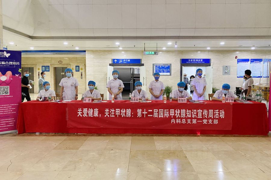 为提高公众对甲状腺疾病的了解,帮助甲状腺疾病患者接受科学的基本常识及治疗管理理念,6月18日,在第十二届国际甲状腺知识宣传周到来之际,内科第一支部联合内分泌科组织医护人员在门诊大厅,开展了“关爱健康,关注甲状腺”甲状腺知识主题宣传活动。活动中,内分泌科的医务人员以甲状腺患者为对象,进行疾病管理的免费咨询,提高患者合理治疗依从性;并以高危人群为对象进行疾病常识宣讲,提高患者就诊率,现场气氛活跃,得到了患者肯定和赞扬,取得了良好的社会效应。