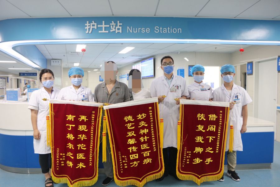 “非常感谢你们,如果不是你们鼓励和治疗,我可能还继续躺在床上待人服侍。”6月18日上午,患者吴某和家人来到州医院康复科医生办公室,将分别书写“借阁下之手,恢复我脚步“”妙灸神针医百病,德艺双馨传四方“”再现华佗医术,南丁格尔之情“的三面锦旗送到科主任刘德红手上,并连声道谢。