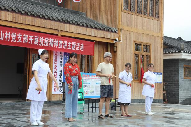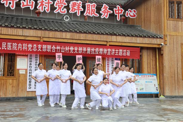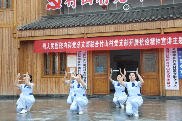 活动中,在凤凰县麻冲乡竹山村,内科支部全体党员集体重温党章、入党誓词和入党志愿书。随后,医院援鄂医疗队队长何忠主任、黄娟护士长通过讲故事的形式做了一场抗疫先进事迹宣讲。内科党总支的党员和竹山村村民听后深受鼓舞,表示在今后要向“最美奋斗者”学习。内科党支的医护人员精心准备了情景剧《咳嗽礼仪》、舞蹈《手护健康》和献给抗疫英雄的舞蹈《感谢,有您》三个节目,在表演的同时也宣讲了新冠肺炎防控知识。