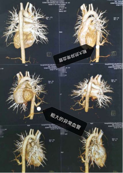 术前CT表现(左下肺囊性变并感染) CT成像后异常血管显示
