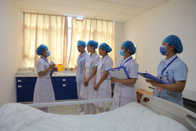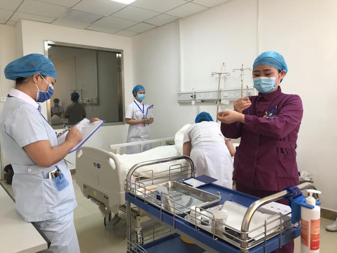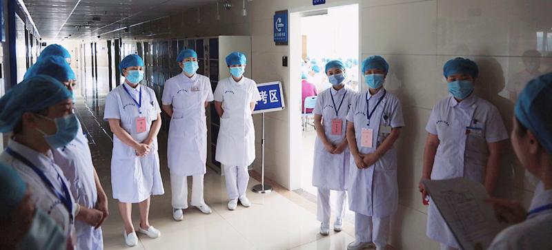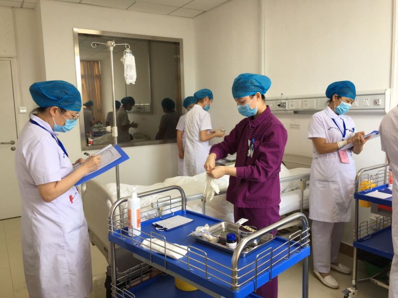 护理技术操作。整个考试分4个考场,每3人一组进行考核,每个考官对考生一对一进行考核,由浅入深,循序渐进,针对操作中的重点、难点严格把关,并把