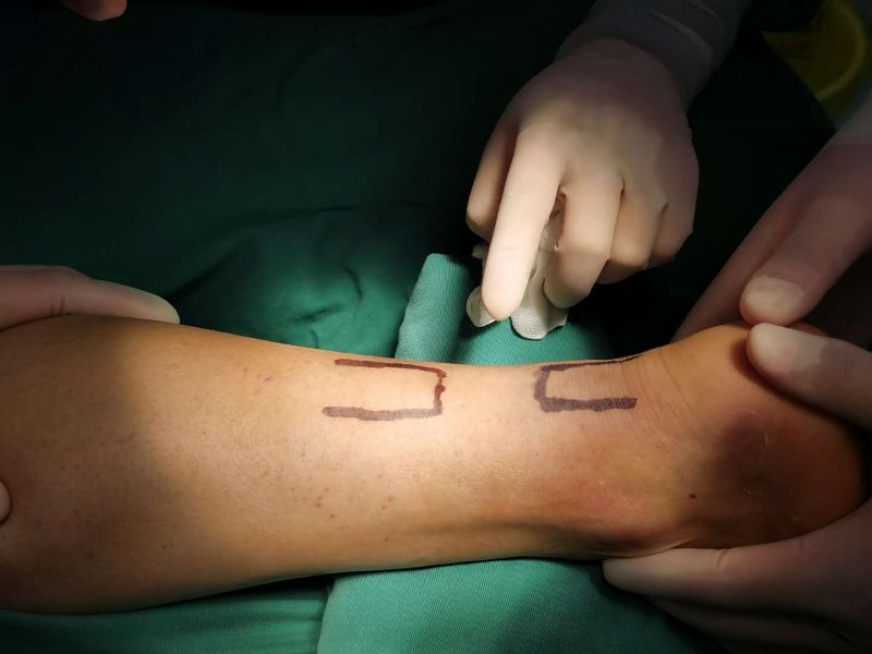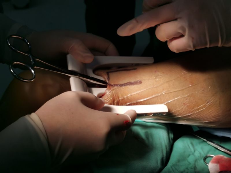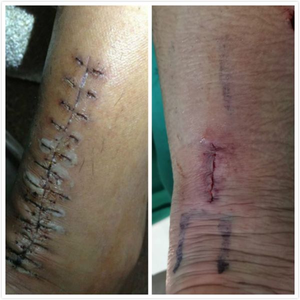 “如果为刘先生采用传统手术方式切开吻合肌腱,切口一般需要9-10CM,术中对正常机体组织破坏较严重,同时易出现切口创面感染、皮肤坏死、粘连、跟腱外露等术后并发症。”朱光宏介绍:微创跟腱断裂吻合术可以将伤口缩短至2-3cm,除了美观之外、损伤小,为术后快速恢复原有运动功能提供有力保障。