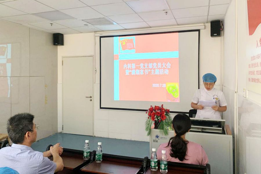 内科第一支部书记带领大家学习了《新时代公民道德建设实施纲要》《新时代爱国主义教育实施纲要》和“应急救护、国防知识”相关内容。随后开展的“潇湘家书”主题活动,以援鄂英雄李康花为代表深情诵读了“老公写给她的家书”,读毕大家纷纷发言畅谈感想。