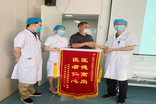“感谢你们,你们辛苦了,她现在恢复得挺好,我早就做好了锦旗,要来科室感谢你们,由于扶贫工作比较忙,一时抽不开身,这次终于抽时间特地把锦旗送过来,向你们表示感谢,正是你们过硬的专业技术、热情周到的服务,才让她的病情得到了有效的治疗。” 他握着心内三科主任彭学军的手激动地说。