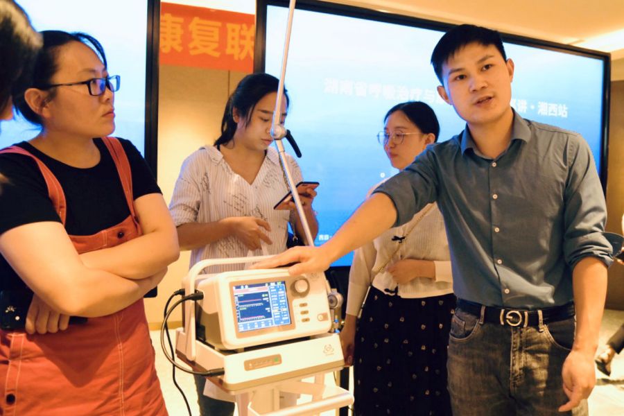 中南大学湘雅二医院教授现场授课,耐心解读高流量氧疗仪、无创呼吸机、肺康复施行的必要性,通过实际操作演练等方式手把手讲述细节管控。同时,会议重点强调“如何有效提高基层医院呼吸治疗与肺康复水平”,就基层医院氧疗方式的选择、无创通气管理、肺康复中的常见问题及解决方法与参会人员进行了深入交流。