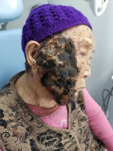患者因右侧颌面部巨大肿瘤于7月4日到我院耳鼻咽喉头颈外科病房治疗,结合当地医院的活检结果显示为:“可见异型细胞”,初步诊断右侧颌面部巨大恶性肿瘤。该肿瘤折磨着患者1年多, 特别是近1个月来无法进食,营养极差,因此患者及家属有着强烈的手术愿望。