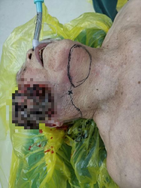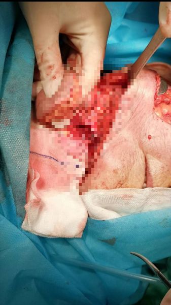 7月8日,在陈华的指导下,由主治医师田保主刀,成功为患者在全麻下进行了右侧颌面部巨大恶性肿瘤扩大切除、颏下动脉皮瓣修复、颈淋巴结清扫术,手术过程顺利。