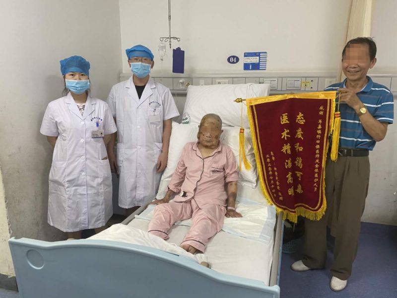 8月13日,湘西州人民医院耳鼻喉头颈外科应用颏下皮瓣为93岁高龄患者成功修复颌面部缺损并康复出院,患者家属送上锦旗表示谢意。