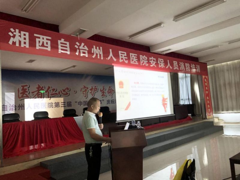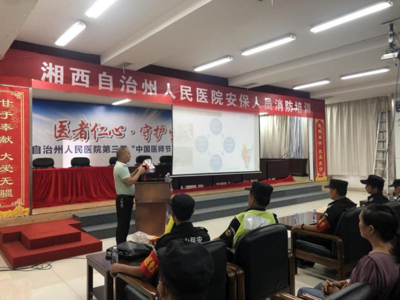 为保障医院安全的医疗环境,消除火灾隐患,提高安保人员的消防基础知识,提升安保人员扑救初起火灾的能力,8月21日,州人民医院保卫科与远山保安公司组织驻我院110余名保安队员开展消防知识培训与灭火演练。