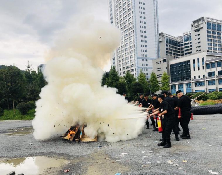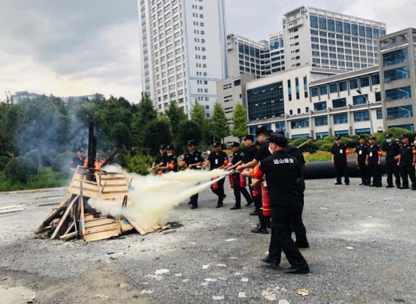 培训结束后,保卫科组织参加培训的安保人员来开展灭火器实操演练。