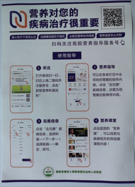 为进一步推进“智慧医院”建设,打造全新“互联网+营养健康,医院+家庭(H-to-H)”管理模式,实现创新营养服务,湘西州人民医院营养科于2020年申报了中国医促会的“医院智慧营养教育与服务发展项目示范单位”,患者以及群众可以通过手机微信小程序,享受便捷、科学、安全的医学营养服务。