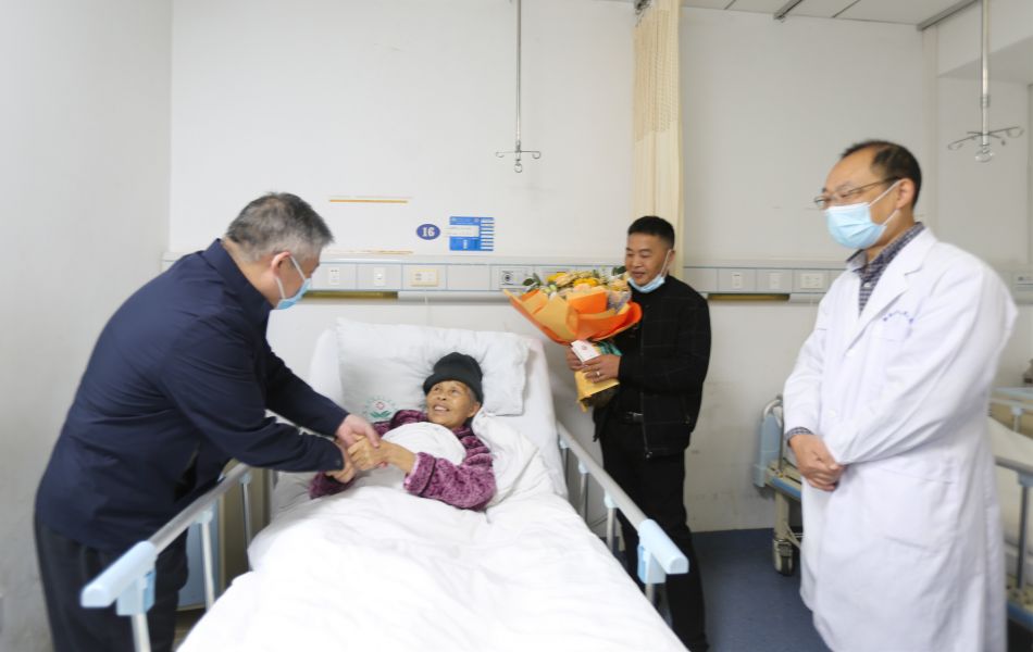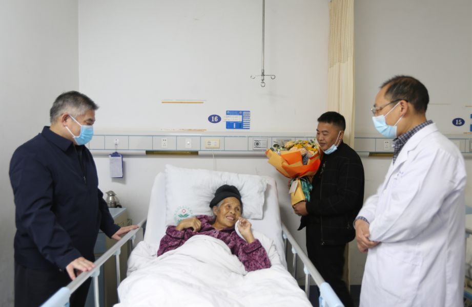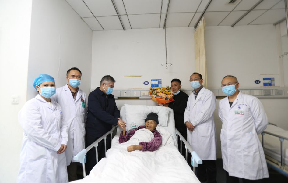 神经外二科医务人员到到病房慰问即将准备出院的花垣县十八洞村龙德成老人,并送上鲜花恭喜她出院。