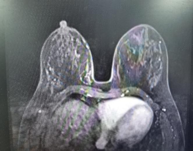 患者张女士出于对自身美的追求,有强烈保留乳房外形的愿望,希望经过系统化治疗后仍能拥有对称挺拔的双乳。因患者张女士乳房较大且有轻度下垂,术前MRI评估乳房有可疑多发病灶,不适合保乳,且患者也不愿意保乳,但是单纯假体乳房重建难以达到乳房自然下垂的效果。 面对种种难题,经术前评估和测量,以及MDT多学科讨论,结合患者张女士自身情况,唐培志带领的乳腺团队为其制定了个体化完整的治疗方案。最终医患双方共同确定施行“保留乳头乳晕复合体的乳腺癌改良根治术+背阔肌肌皮瓣联合假体即刻乳房重建术”。手术顺利、术后康复效果满意。