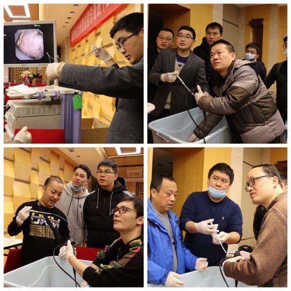 培训现场,相关技术顾问详细讲解了胆道镜使用过程中的注意事项及维护事宜。并提供了3台高清胆道镜供与会人员进行实际操作练习。采用新鲜牛肺,内置入石子模拟平时胆道取石手术工作环境,大家积极参与练习胆道镜操作及经胆道镜取石,一边操作一边分享经验。